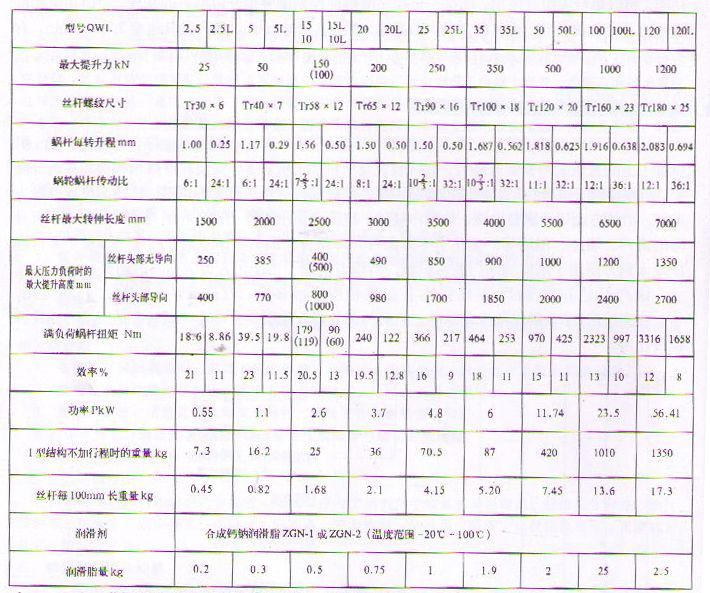 QWL蝸輪絲桿升降機是一種基礎(chǔ)起重部件,符合JB/T8809—1998(原JB/ZQ4391—86)標(biāo)準(zhǔn)。該產(chǎn)品可廣泛用于機械、冶金、建筑、化工、醫(yī)療、文化衛(wèi)生等各個行業(yè)。承載能力2.5—120T。具有結(jié)構(gòu)緊湊、體積小、重量輕、動力源廣泛、噪音小、安裝方便、使用靈活、功能多、配套形式多、可靠性高、使用壽命長等優(yōu)點。具有提升、降落、推進、翻轉(zhuǎn)等功能,可以單臺或組合使用。QWL絲桿升降機能按一定程序準(zhǔn)確地控制調(diào)整提升或推進的高度,可以用電動機或其它動力直接帶動,也可以手動。最高輸入轉(zhuǎn)速1500r/min,最大提升速度2.7m/min。有不同的結(jié)構(gòu)型式和裝配方式,提升高度按用戶的要求制造。該裝置可以自鎖。